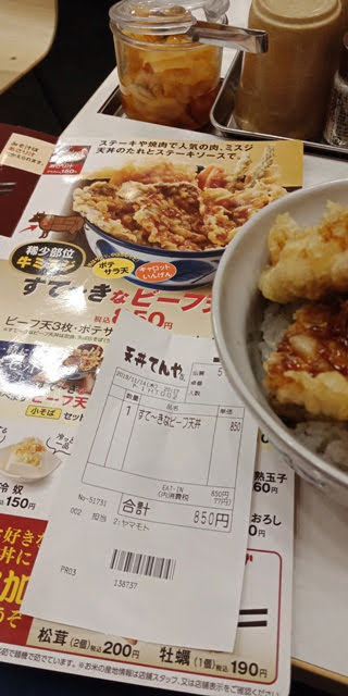 這家天婦羅專賣店路過多次,今天還是第一次吃。 要了碗有炸牛肉,炸松茸,炸青椒,850日元的天婦羅蓋飯,東西不多,但是剛剛好夠飽。